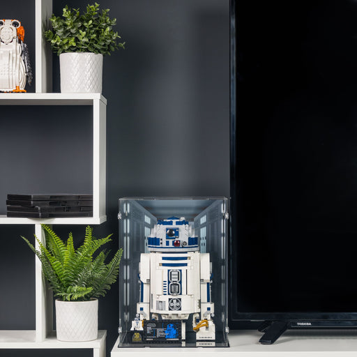 Acrylic display case which fits the 2024 LEGO® Star Wars R2-D2 (R2D2), set 75379. The LEGO R2-D2 can be displayed in an upright stationary position...