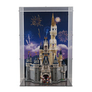This premium display case can be enhanced with an optional printed backdrop showcasing a vibrant firework scene inspired by the real Disney World and Disneyland Resort shows, with a printed grey cobblestone floor to match the castle aesthetic.
