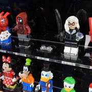 Each minifigure is held tightly in place using 1x2 studs (included), avoiding damage to the feet and fragile brick elements. Most similar competitors use two single studs, which risk bending the materials. Our studs fit most minifigure base types, including black display plates from LEGO minifigure mystery bag/box-style collections.